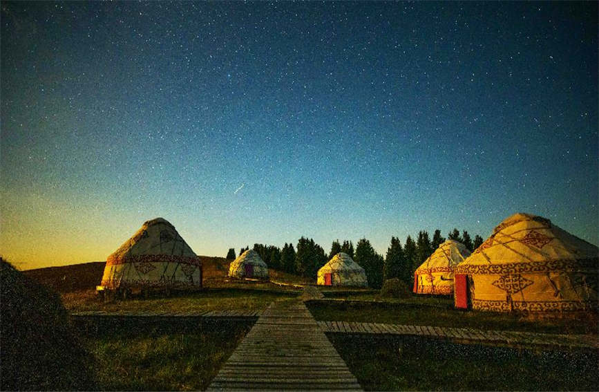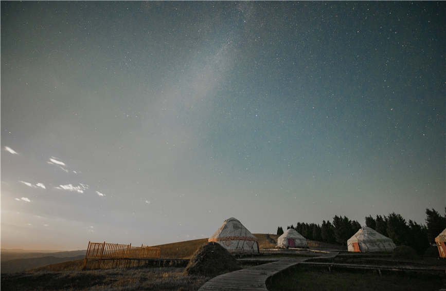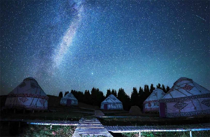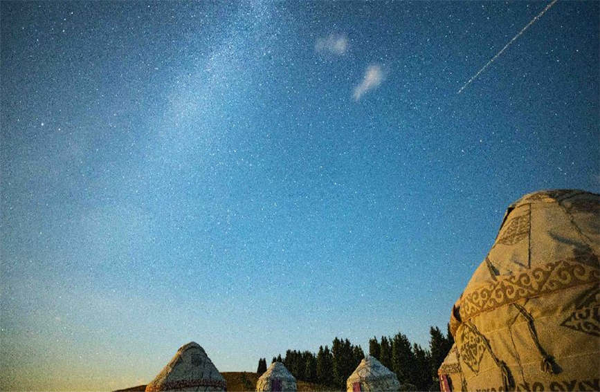The yurts and the boundless starry sky form a spectacle at Aktas grassland in Tekes County, Ili Kazak Autonomous Prefecture, northwest China's Xinjiang Uygur Autonomous Region. (Photo/Tayier)
