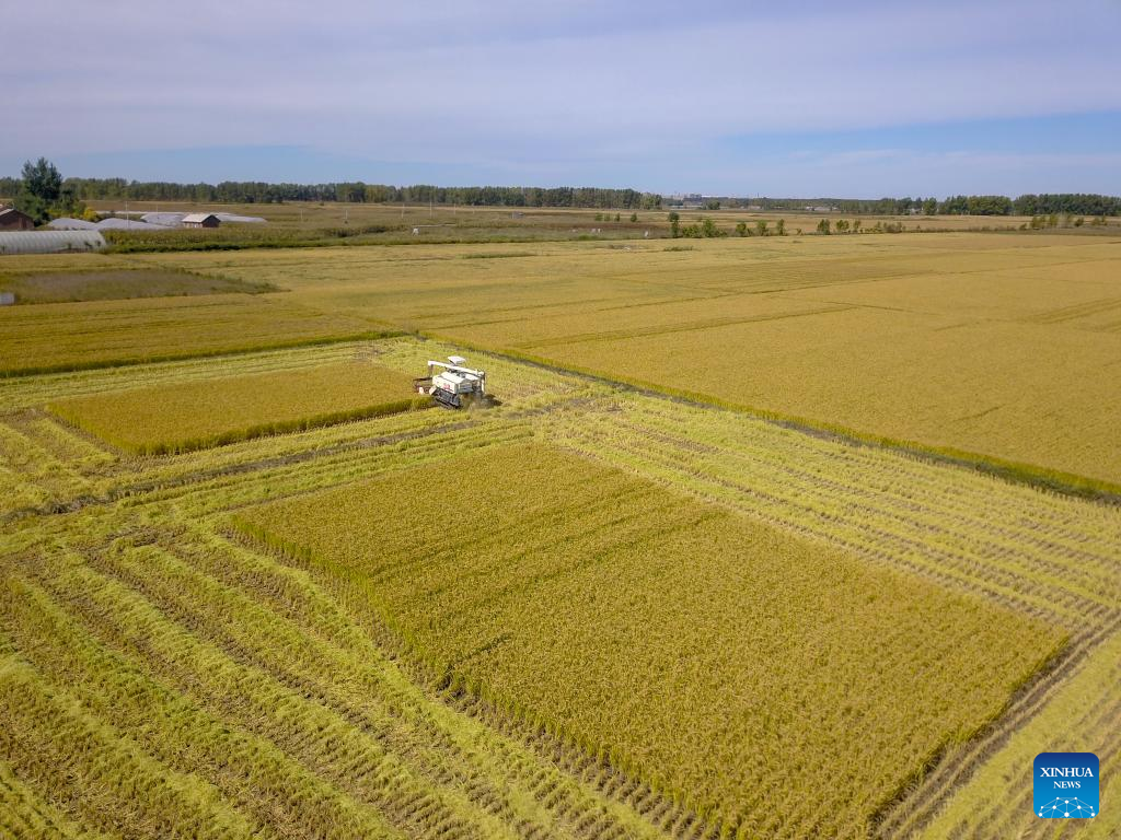 A farmer drives a farming machinery to harvest rice at a family farm in Jiutai District of Changchun, northeast China's Jilin Province, Sept. 20, 2022. Autumn harvest has recently started at the rice-growing areas across the province. (Xinhua/Yan Linyun)