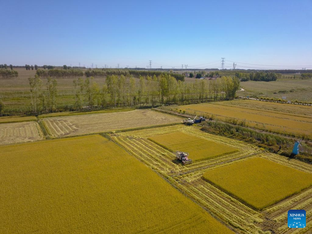 Aerial photo taken on Sept. 20, 2022 shows a farmer driving a farming machinery to harvest rice at a family farm in Jiutai District of Changchun, northeast China's Jilin Province. Autumn harvest has recently started at the rice-growing areas across the province. (Xinhua/Zhang Nan)