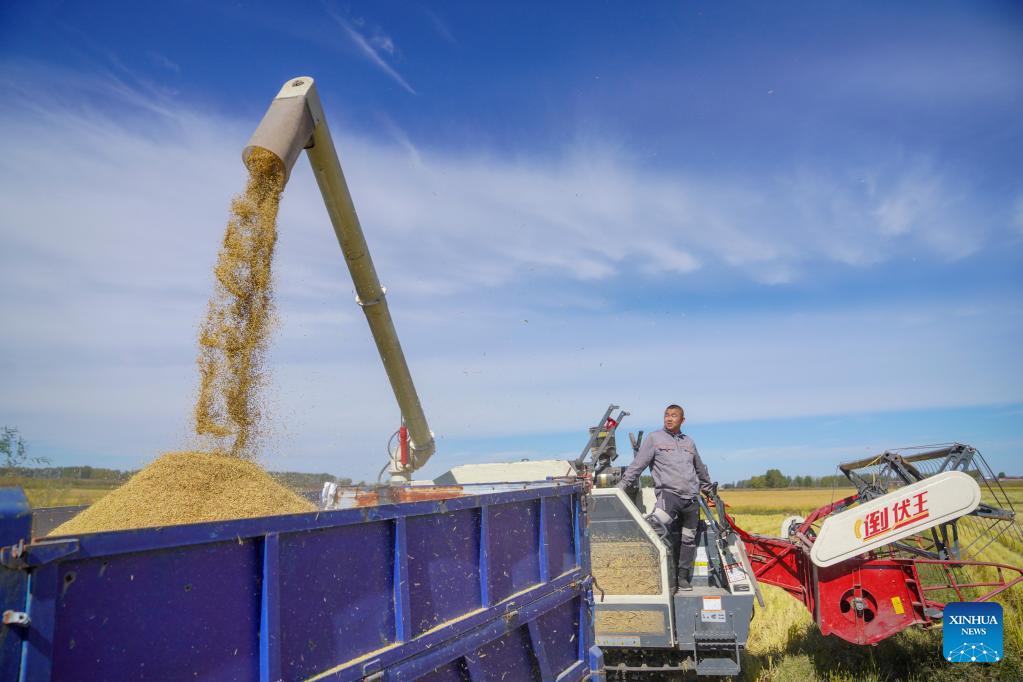 A farmer checks the harvested rice at a family farm in Jiutai District of Changchun, northeast China's Jilin Province, Sept. 20, 2022. Autumn harvest has recently started at the rice-growing areas across the province. (Xinhua/Zhang Nan)