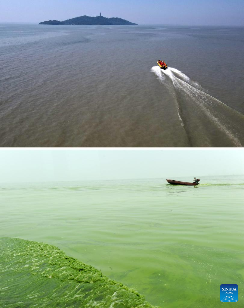 Combo photo shows a view of a wetland around the Chaohu Lake on July 9, 2021 (upper, Photo by Ye Yuting/Xinhua) and a view of the Chaohu Lake in Hefei City, east China's Anhui Province, April 7, 2008 (Photo by He Xibin/Xinhua). As the fifth-largest freshwater lake in China, Chaohu Lake is known as the "kidney" of the Yangtze River.