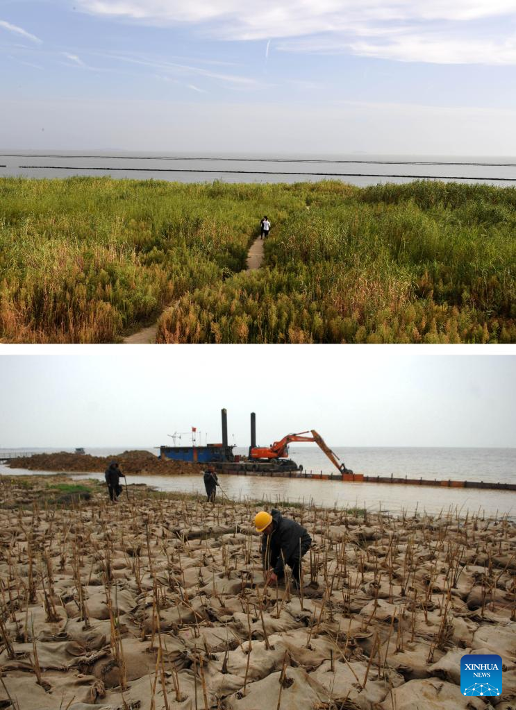 Combo photo shows a view of a reed wetland around the Chaohu Lake on Sept. 6, 2022 (upper, Xinhua/Liu Junxi) and workers planting reeds around the Chaohu Lake in Hefei City, east China's Anhui Province, April 6, 2010 (Xinhua). As the fifth-largest freshwater lake in China, Chaohu Lake is known as the "kidney" of the Yangtze River.