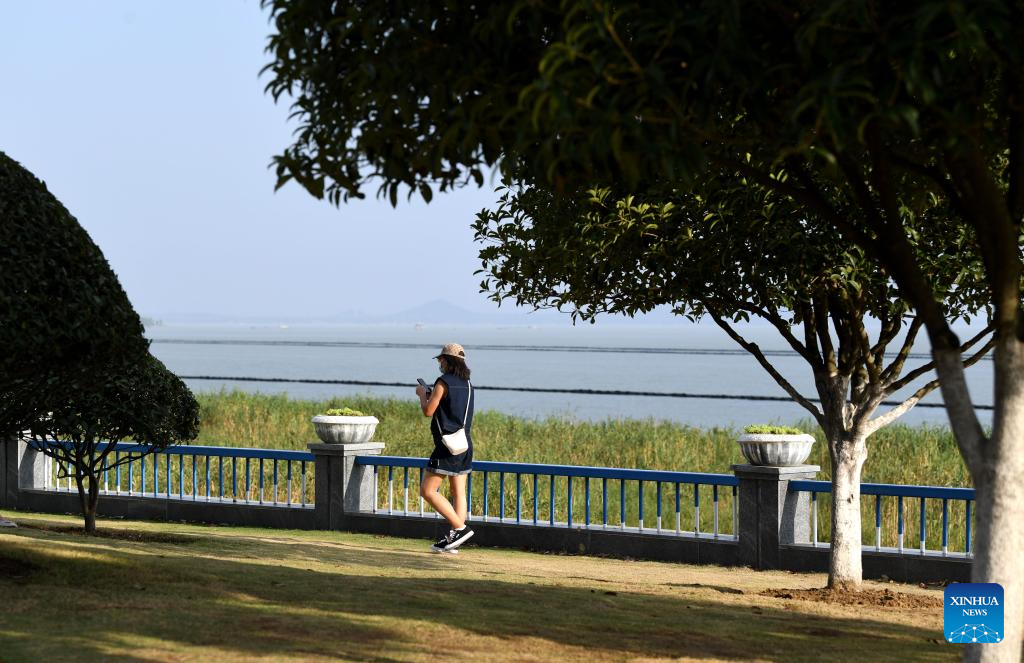 A woman enjoys herself in a park at the bank of the Chaohu Lake in Hefei City, east China's Anhui Province, Sept. 6, 2022. As the fifth-largest freshwater lake in China, Chaohu Lake is known as the "kidney" of the Yangtze River.