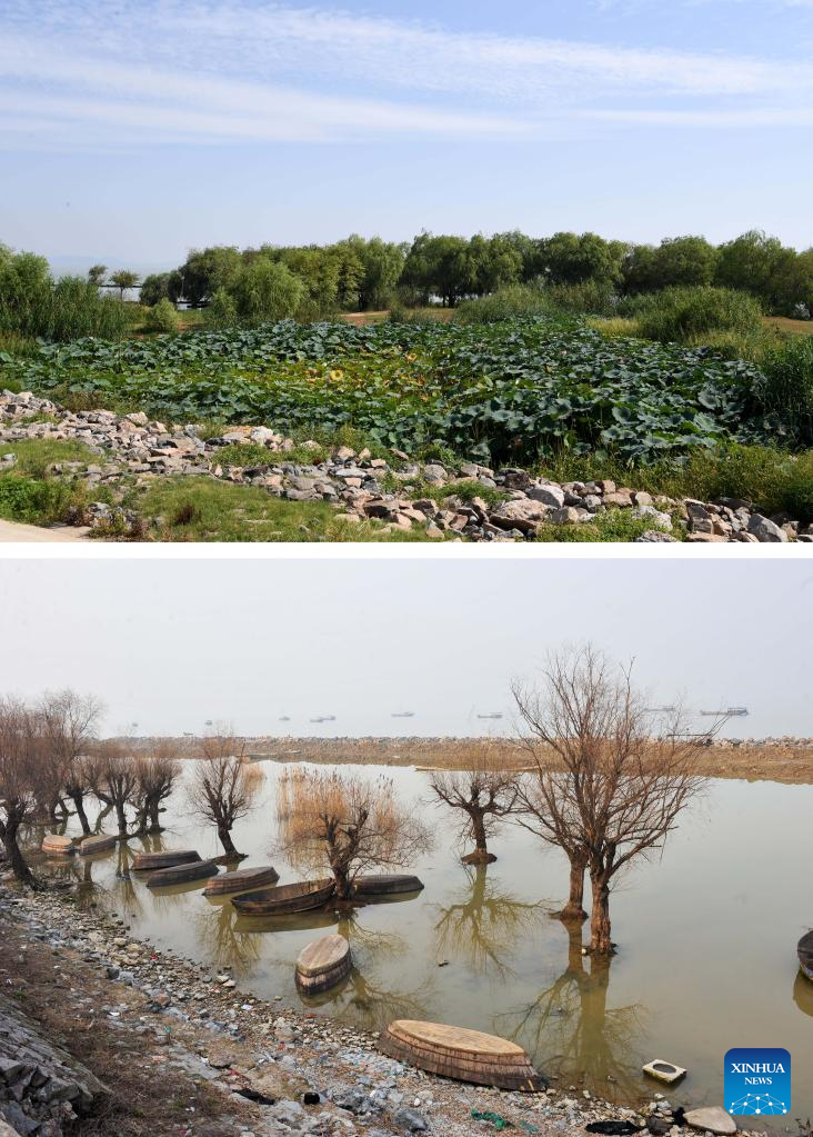 Combo photo shows a view of a wetland around the Chaohu Lake on Sept. 6, 2022 (upper, Xinhua/Liu Junxi) and trees at the bank of the Chaohu Lake in Hefei City, east China's Anhui Province, Feb. 17, 2012 (Photo by He Xibin/Xinhua). As the fifth-largest freshwater lake in China, Chaohu Lake is known as the "kidney" of the Yangtze River.