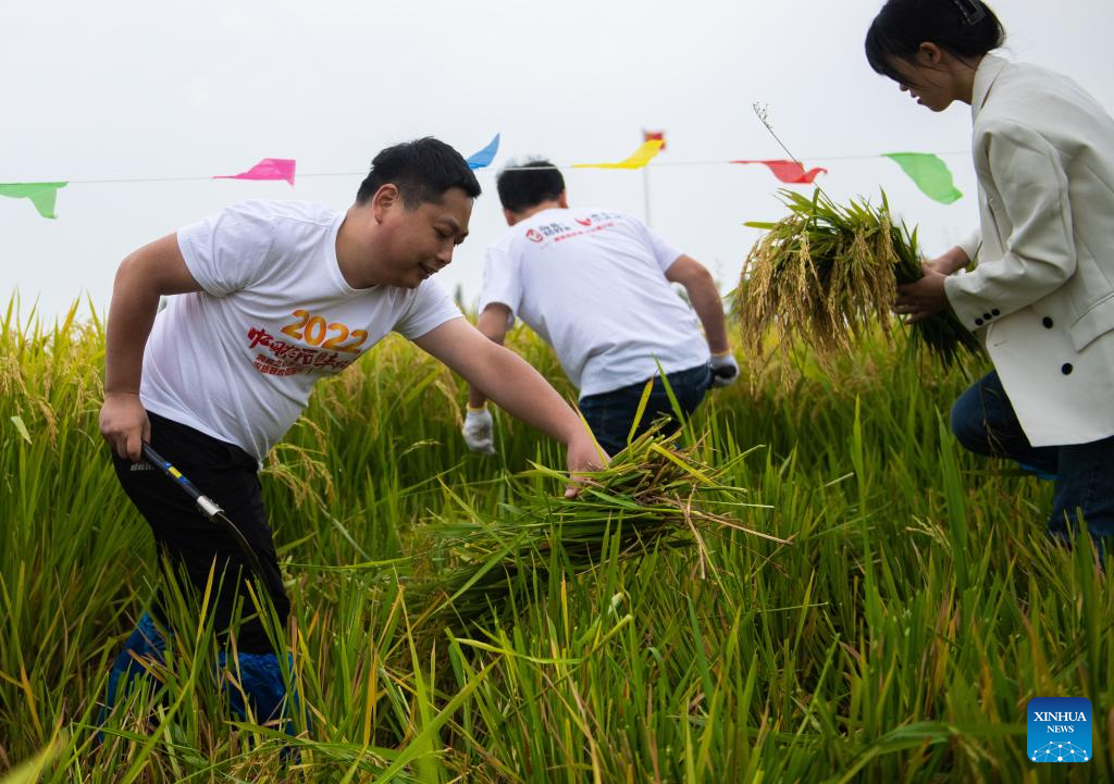 People participate in a rice harvesting game in Dongsheng Village of Mahekou Township in Nanxian County, central China's Hunan Province, Sept. 21, 2022. A paddy fun game was organized here on Wednesday for locals and tourists to welcome the upcoming Chinese farmers' harvest festival. (Xinhua/Chen Sihan)