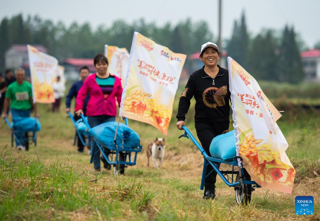 People participate in a wheelbarrow race in Dongsheng Village of Mahekou Township in Nanxian County, central China's Hunan Province, Sept. 21, 2022. A paddy fun game was organized here on Wednesday for locals and tourists to welcome the upcoming Chinese farmers' harvest festival. (Xinhua/Chen Sihan)