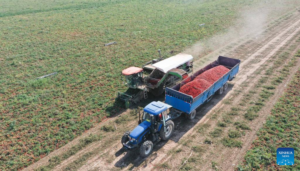 Aerial photo shows villagers havesting tomatoes in Xingfu Village of Changji, northwest China's Xinjiang Uygur Autonomous Region, Sept. 19, 2022. (Photo by Feng Guofeng/Xinhua)