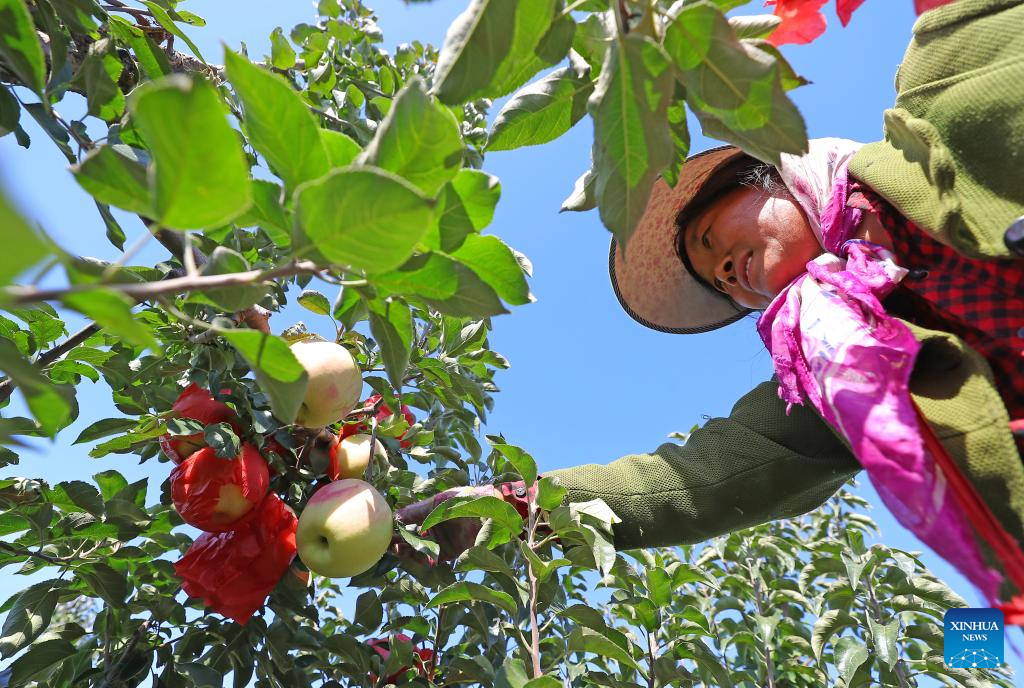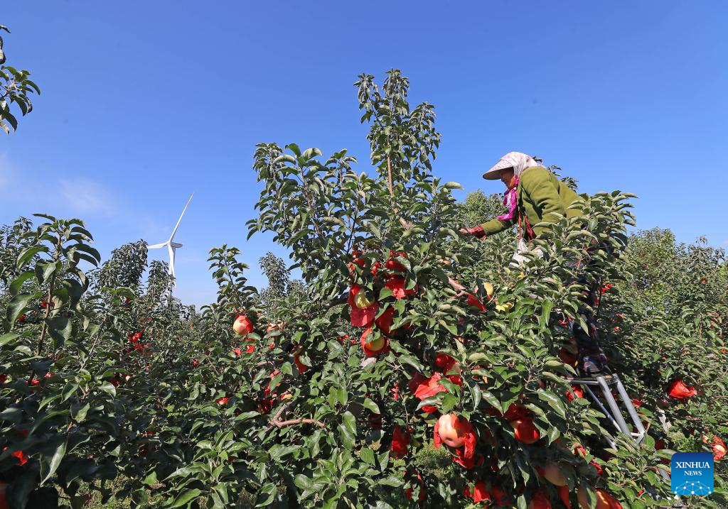 A farmer removes the bags covering apples at an orchard in Fangjiatun Town, Kangping County, Shenyang City, northeast China's Liaoning Province, Sept. 21, 2022. Kangping County has witnessed bumper harvests of its landmark products millet, apple and sweet potato, with planting areas of 5,000 mu (about 333 hectares) , 35,000 mu (about 2,333 hectares) and 20,000 mu (about 1,333 hectares) respectively. (Xinhua/Yang Qing)