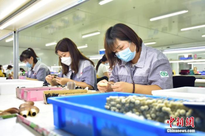 Staff members of "Qinzhi," a domestic makeup brush manufacturer in Qingxian county, Cangzhou city, north China's Hebei Province, shape makeup brushes with knives, on June 9, 2022. (China News Agency/Yin Xiangping)