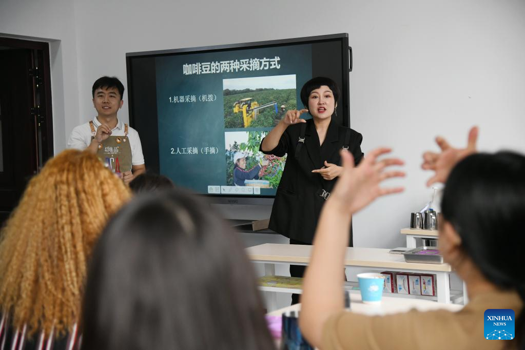 Hearing-impaired trainees attend a barista training class at Shaanxi Urban Economy School in Xi'an, capital of northwest China's Shaanxi Province, Sept. 22, 2022. The International Day of the Deaf falls on the fourth Sunday each September. Since 2019, Shaanxi Urban Economy School has been providing free barista training for the hearing-impaired. Trainees can learn coffee-making skills as well as cafe operation knowledge during the training programme, which could help them in paving the way either to start their coffee business or get employed in this industry. So far, more than 20 people who have graduated from the training programme are working at cafes in various places across China. (Xinhua/Zheng Xin)