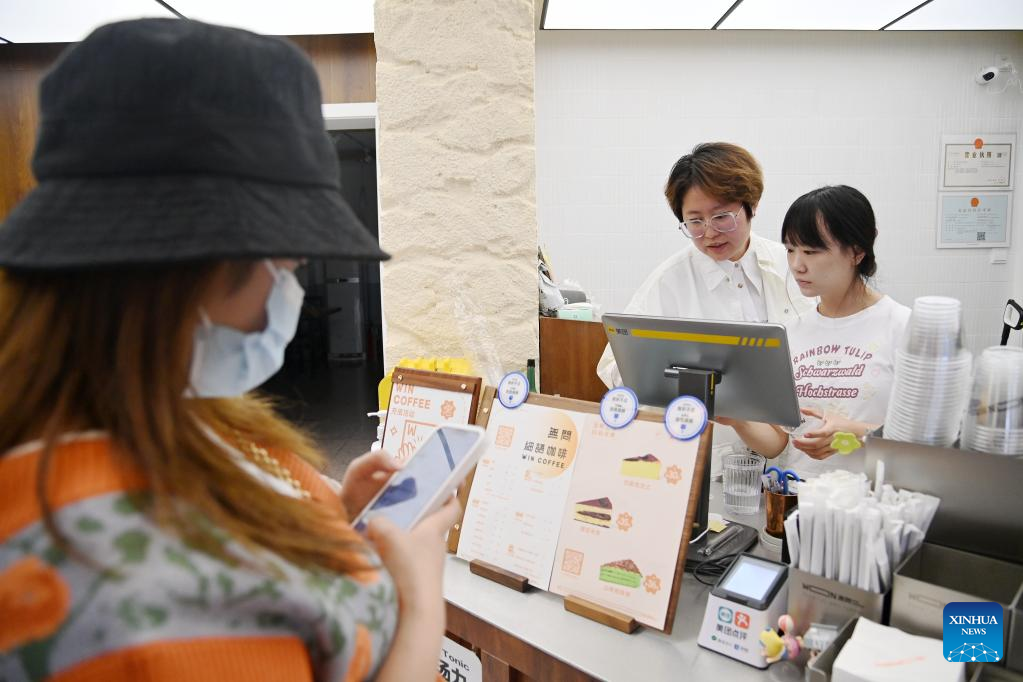 Chen Jiayue (C), a hearing-impaired barista, works at her own cafe in Xi'an, capital of northwest China's Shaanxi Province, Sept. 24, 2022. The International Day of the Deaf falls on the fourth Sunday each September. Since 2019, Shaanxi Urban Economy School has been providing free barista training for the hearing-impaired. Trainees can learn coffee-making skills as well as cafe operation knowledge during the training programme, which could help them in paving the way either to start their coffee business or get employed in this industry. So far, more than 20 people who have graduated from the training programme are working at cafes in various places across China. (Xinhua/Li Yibo)