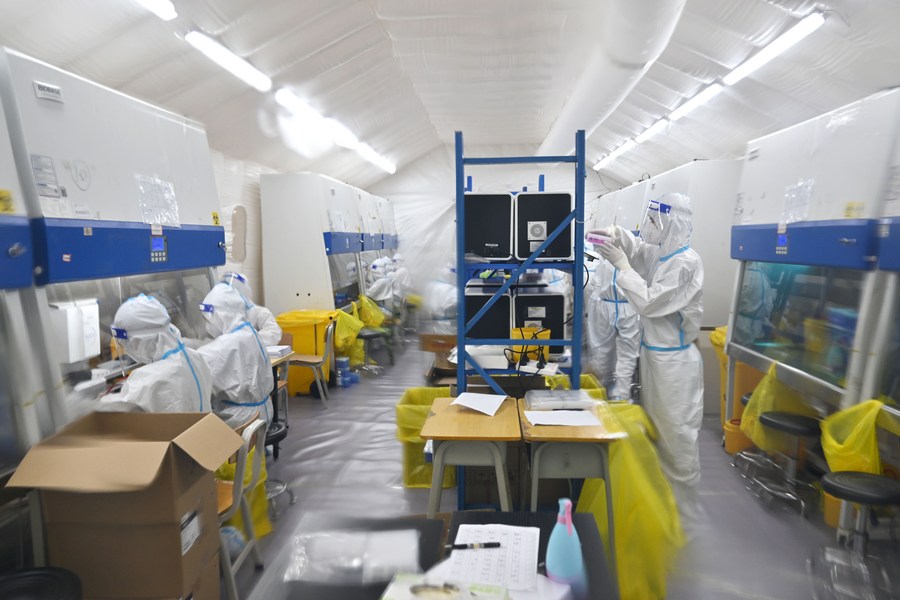 Medical workers from south China's Guangdong Province, aiding fight against the COVID-19 for Hainan, test nucleic acid samples in Sanya, south China's Hainan Province, Aug. 11, 2022. (Xinhua/Guo Cheng)