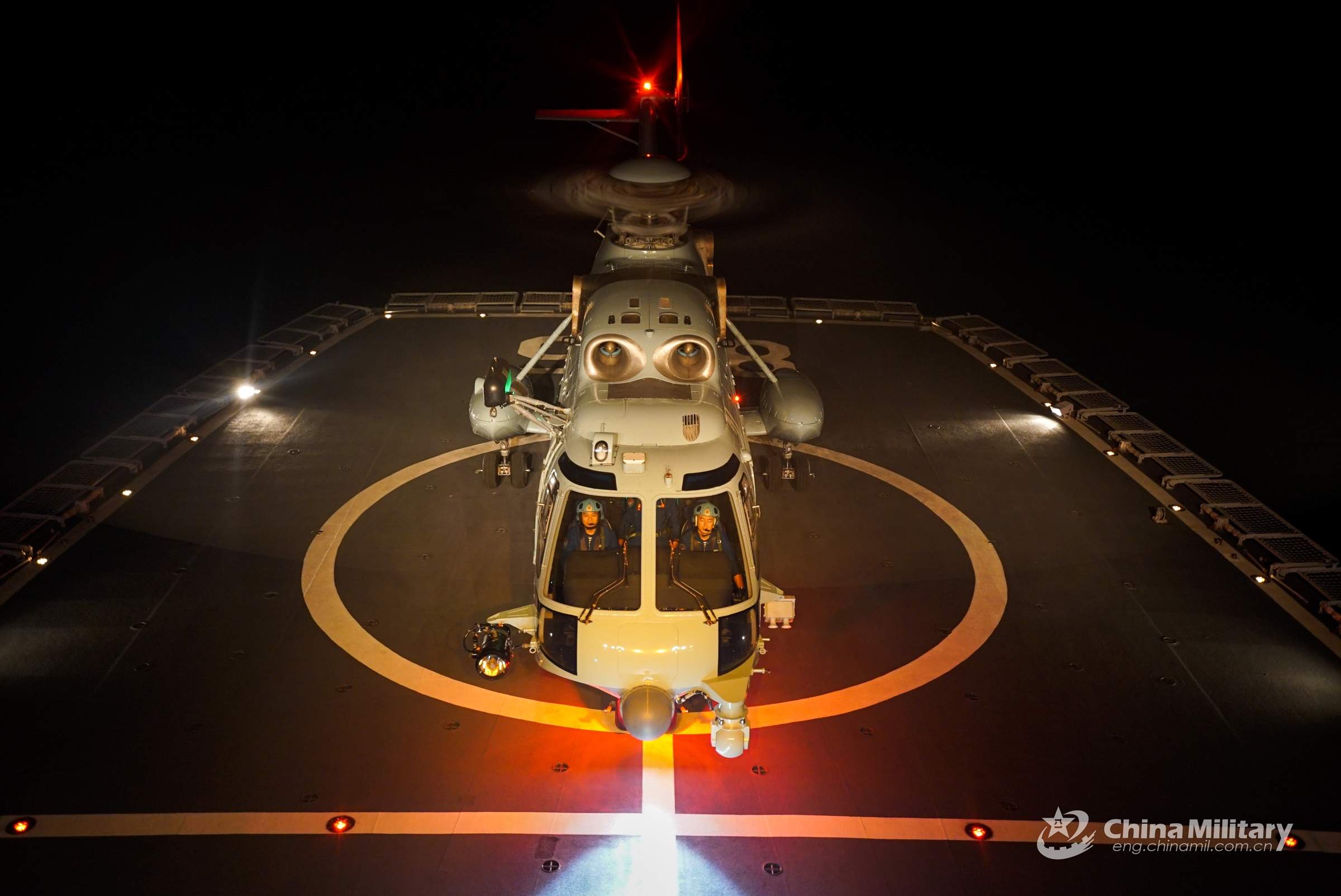A ship-borne helicopter lands on the helipad of a warship during a round-the-clock training exercise on landing and taking off from the ship's helipad on September 7, 2022. The training was jointly carried out by the units from a naval search and rescue flotilla under the PLA Northern Theater Command and the PLA Naval Aeronautical University. (eng.chinamil.com.cn/Photo by Ma Yingming)