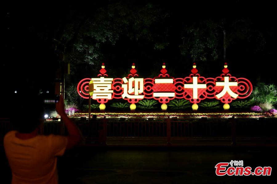 A flower display with the theme of 'Welcome to the 20th CPC National Congress' is set up along the Chang'an Avenue in Beijing to celebrate the National Day, Sept. 26, 2022. (Photo: China News Service/Yi Haifei)
