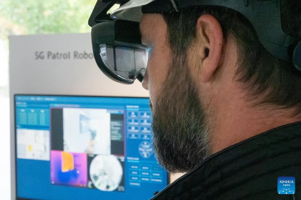 A 5G patrol robot is seen during Huawei's European Innovation Day in Budapest, Hungary, on Sept. 27, 2022. (Photo by Attila Volgyi/Xinhua)