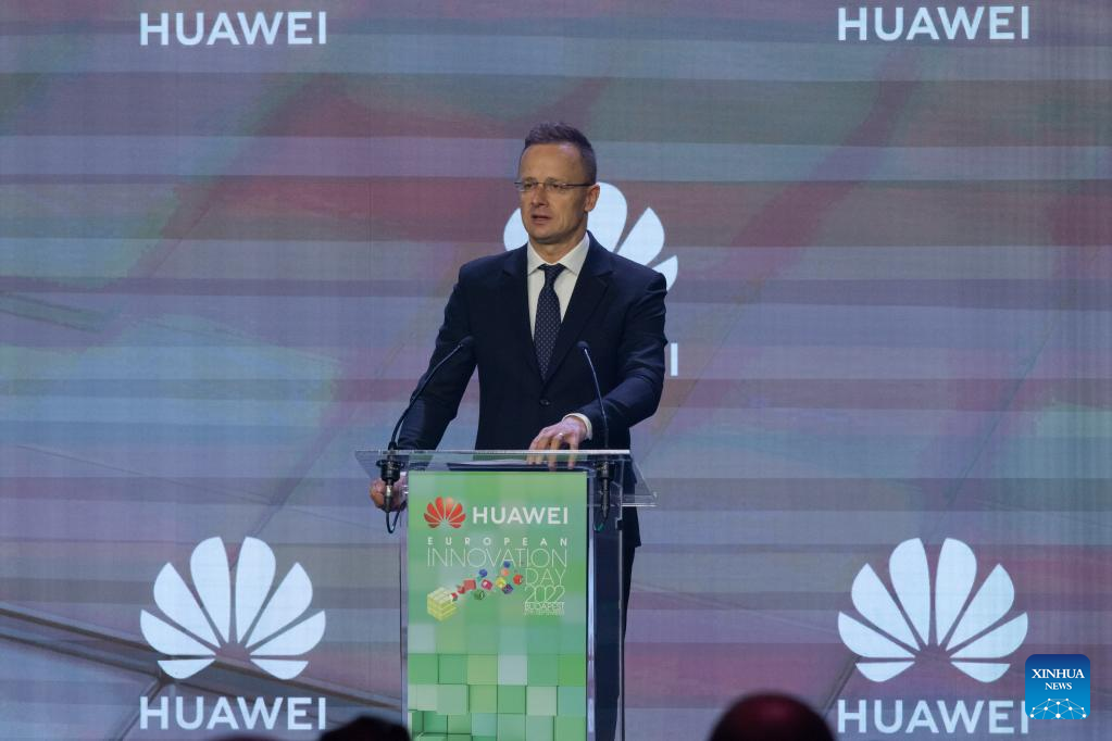 Hungarian Minister of Foreign Affairs and Trade Peter Szijjarto delivers a speech during Huawei's European Innovation Day in Budapest, Hungary, on Sept. 27, 2022. (Photo by Attila Volgyi/Xinhua)
