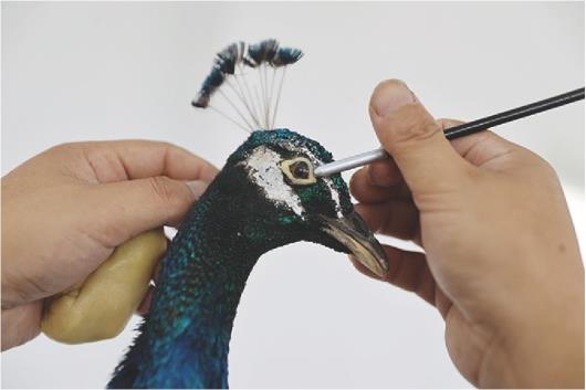 Dong Tao repairs the eyelid of a peafowl specimen. (Photo/sd.dzwww.com)
