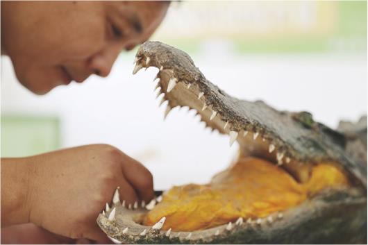 Dong Tao repairs teeth of a crocodile specimen. (Photo/sd.dzwww.com)