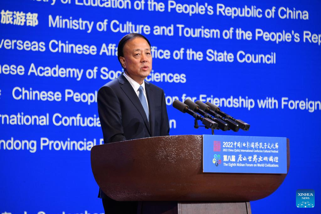 Wu Weihua, vice chairman of the Standing Committee of the National People's Congress, addresses and declares open the 2022 China (Qufu) International Confucius Cultural Festival and the Eighth Nishan Forum on World Civilizations in Qufu, east China's Shandong Province, Sept. 27, 2022. (Xinhua/Li Ziheng)