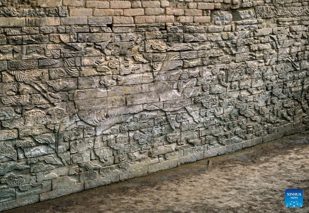 Photo taken on Sept. 21, 2022 shows part of a stone mural discovered in the Zhouqiao relics site in Kaifeng City, central China's Henan Province.