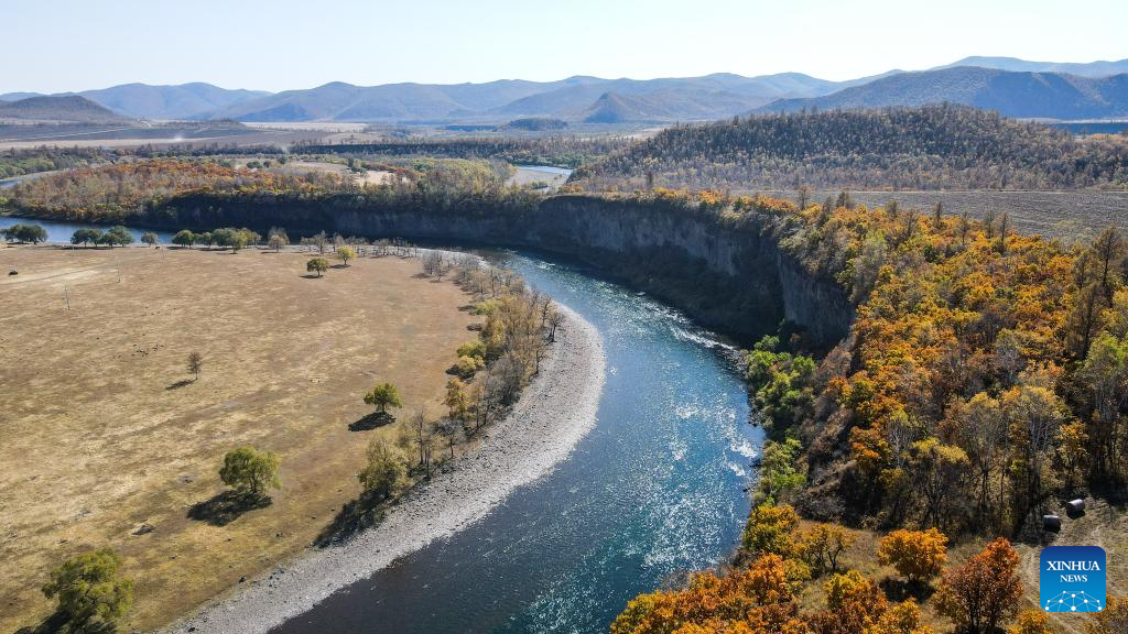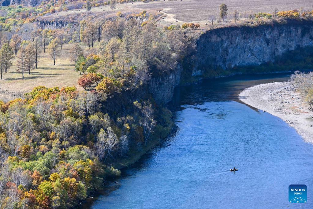 Aerial photo taken on Sept. 27, 2022 shows autumn scenery at Shidawan scenic spot in Chaihe Town, Zhalantun City of north China's Inner Mongolia Autonomous Region. (Xinhua/Wang Zecong)