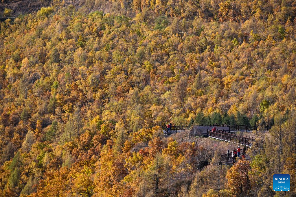 Visitors enjoy autumn scenery at Shidawan scenic spot in Chaihe Town, Zhalantun City of north China's Inner Mongolia Autonomous Region, Sept. 27, 2022. (Xinhua/En Hao)