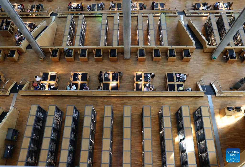 The interior of the Bibliotheca Alexandrina is pictured in Alexandria, Egypt, on Sept. 27, 2022. The China Cultural Center in Cairo on Tuesday donated books and audio-visual products to the Bibliotheca Alexandrina, a major library in the city of Alexandria on Egypt's Mediterranean coast.(Xinhua/Wang Dongzhen)