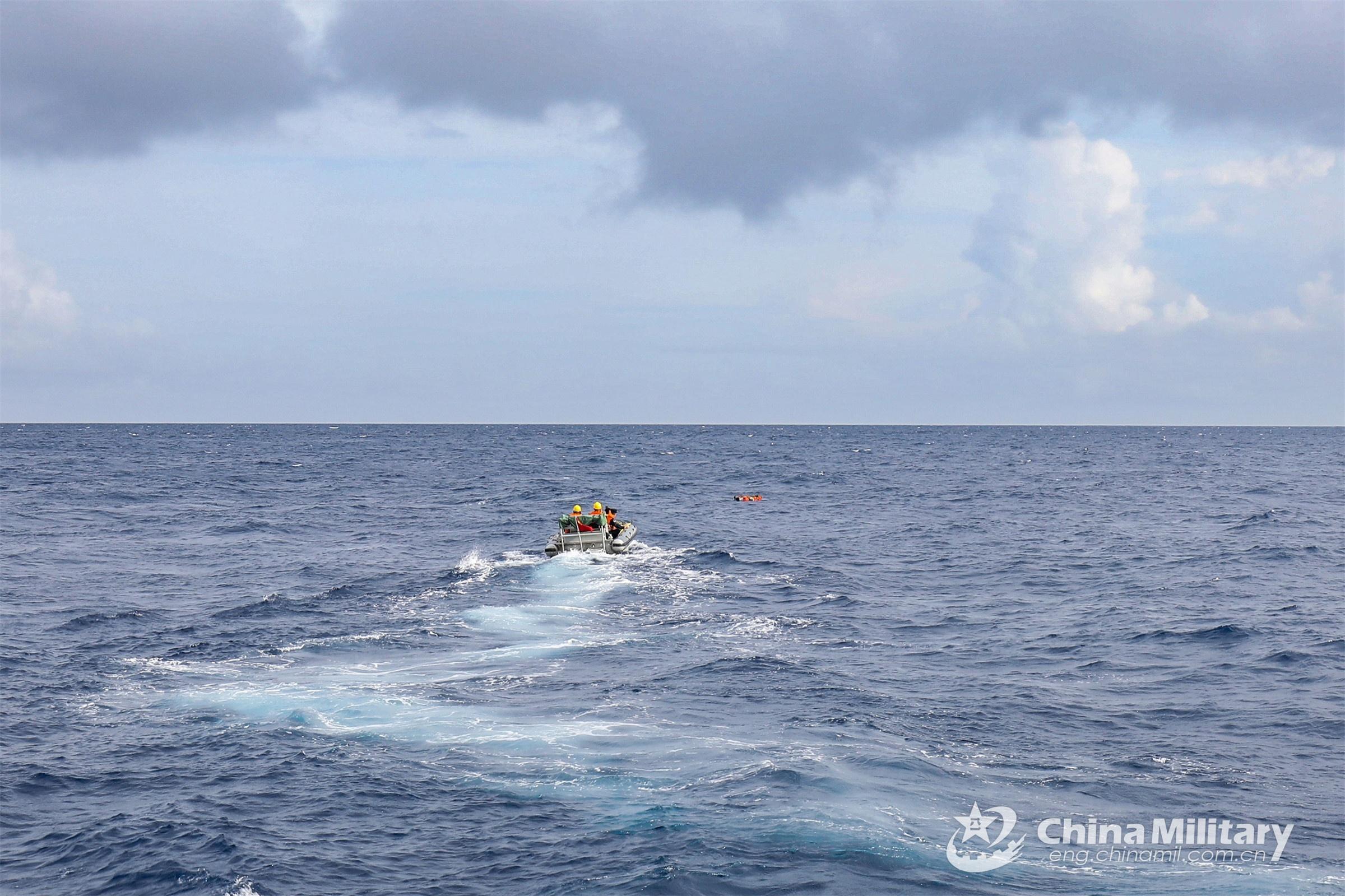 Sailors assigned to a naval frigate flotilla under the PLA Southern Theater Command steer a rigid-hull inflatable boat (RHIB) to rescue the simulated overboard personnel in an all-subject training assessment on September 7, 2022. (eng.chinamil.com.cn/Photo by Zhang Bin)