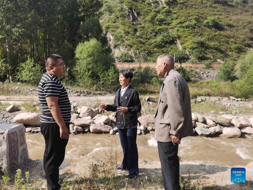 Liu Guizhen (C) talks about issues concerning water supply pipes with staff members of the local water conservancy in Daixian County of north China's Shanxi Province, Sept. 15, 2022. (Xinhua/Liang Xiaofei)