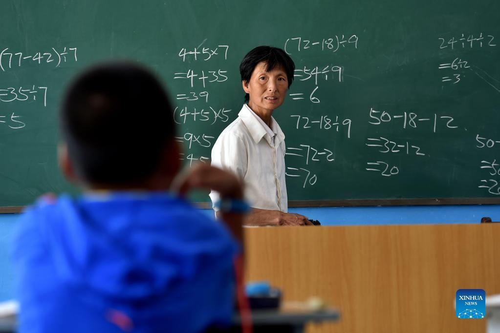 Undated file photo shows Liu Guizhen giving a math lecture at Wangjiahui Primary School, Daixian County of north China's Shanxi Province. (Xinhua/Zhan Yan)