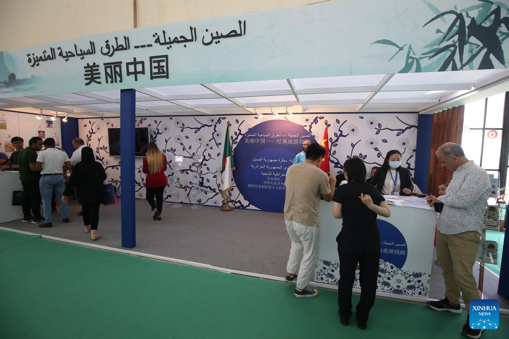 People visit the Chinese embassy's booth at the International Tourism and Travel Exhibition in Algiers, Algeria, on Sept. 29, 2022. The 21st edition of the International Tourism and Travel Exhibition kicked off in Algiers on Thursday after a two-year break due to the COVID-19 pandemic. (Xinhua)