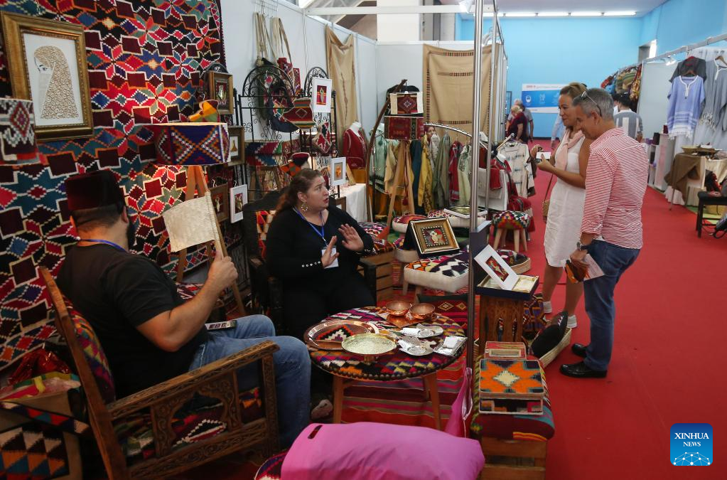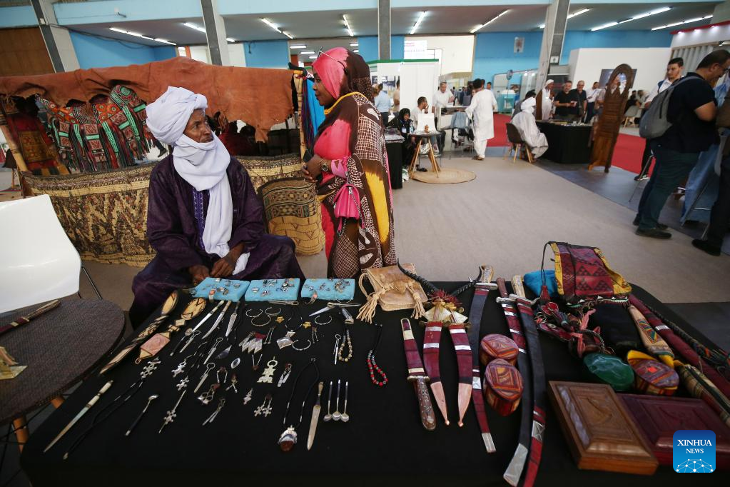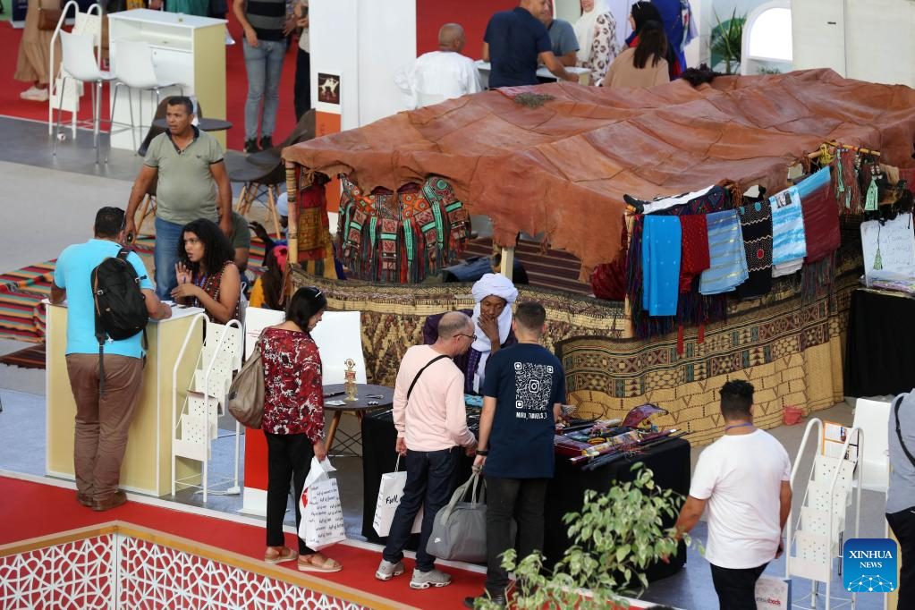 Exhibitors show souvenirs at the International Tourism and Travel Exhibition in Algiers, Algeria, on Sept. 29, 2022. The 21st edition of the International Tourism and Travel Exhibition kicked off in Algiers on Thursday after a two-year break due to the COVID-19 pandemic. (Xinhua)