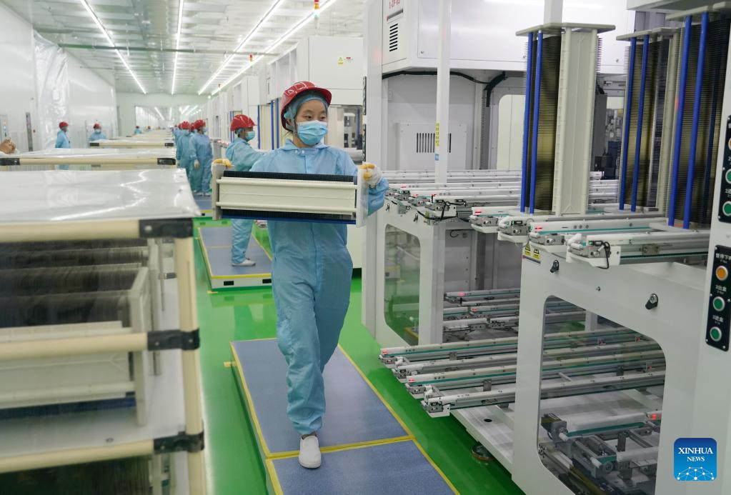 Workers work at a workshop of LONGi Solar Technology (Xixian New Area) Co., Ltd. in Xixian New Area, northwest China's Shaanxi Province, Sept. 28, 2022.