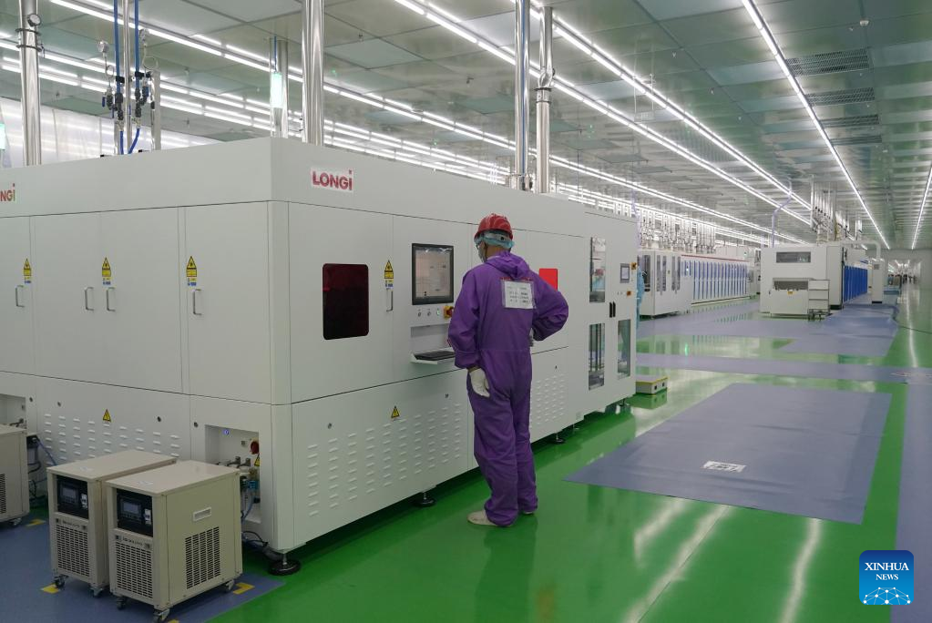 A worker works at a workshop of LONGi Solar Technology (Xixian New Area) Co., Ltd. in Xixian New Area, northwest China's Shaanxi Province, Sept. 28, 2022.