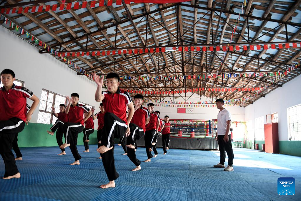 Students practice during a martial arts class under the instructions of coach Li Yinggang at Shaolin Tagou Martial Arts School in Songshan, central China's Henan province, July 6, 2022. 25-year-old Li Yinggang is a coach at Shaolin Tagou Martial Arts School in Songshan, central China's Henan province. He started martial arts practise at the age of 9 and shifted to free combat 3 years later. Since he was 16 years old, Li has been taking part in the professional free combat competitions, ever winning the titles of domestic and international events several times including two golden belts of Chinese National Free Combat League. As Li Yinggang said, practicing traditional martial arts helps a lot for improving his free combat skills. Nowdays, Li aims to impart his understandings and experience of traditional martial arts to students during his classes, hoping they can master the essence of martial arts, and inherit and develop Chinese martial arts. (Xinhua/Wu Gang)