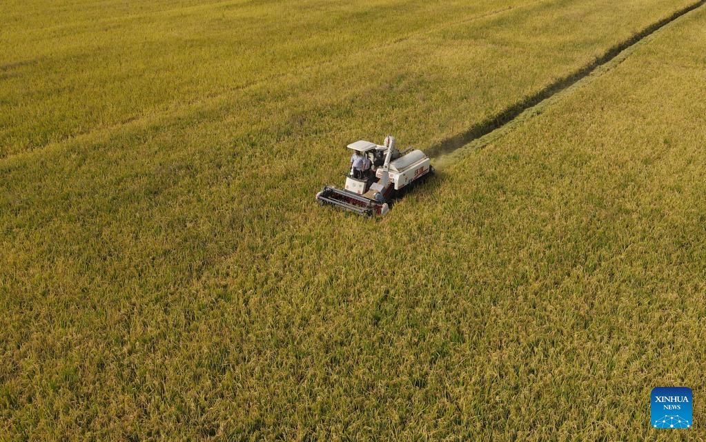 Aerial photo taken on Sept. 29, 2022 shows a farmer driving a reaper harvesting paddy in a field in Gucheng Town of Hefei, east China's Anhui Province. (Xinhua/Zhou Mu)