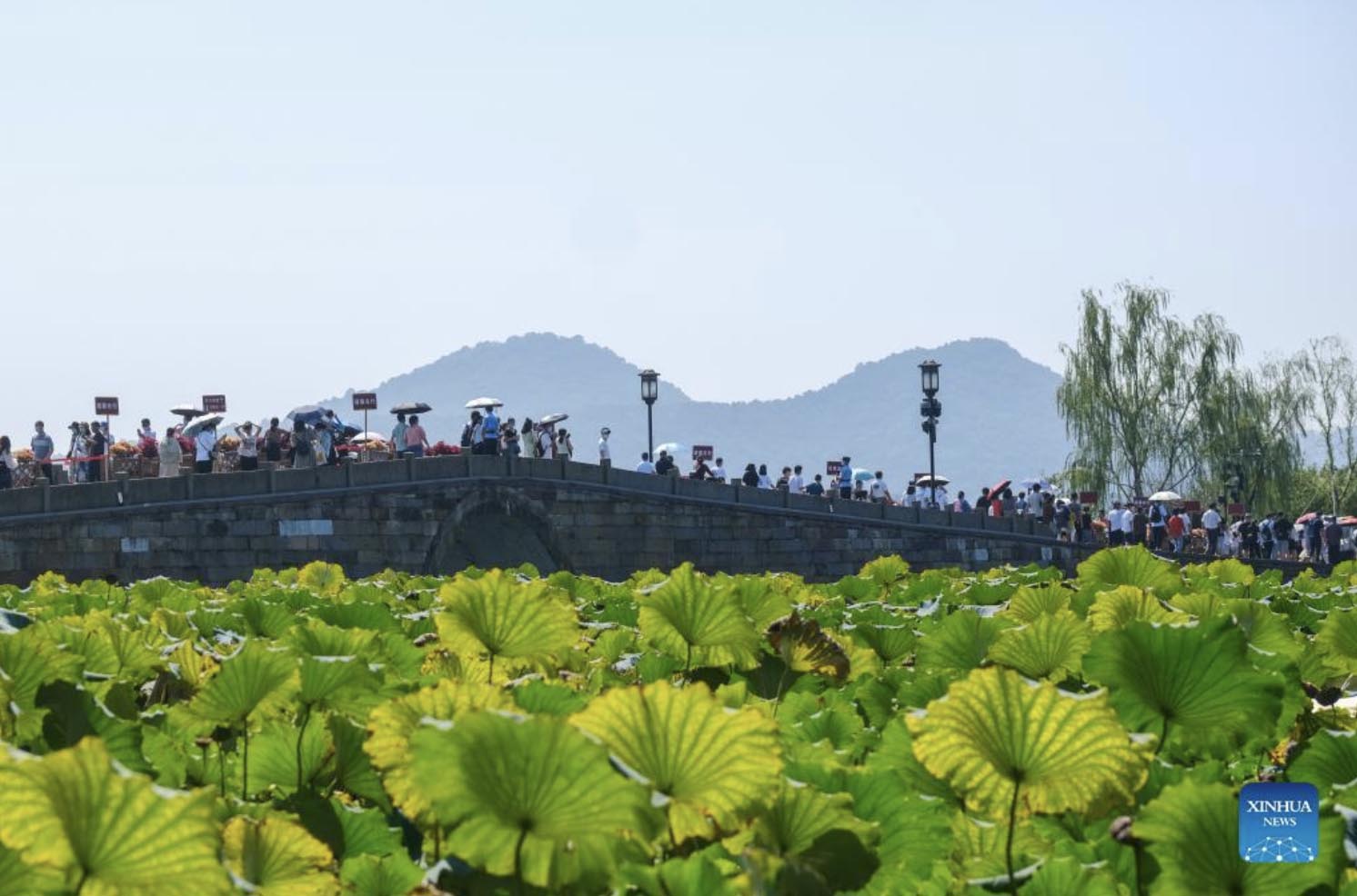 Tourists visit the West Lake scenic area during the National Day holiday in Hangzhou, east China's Zhejiang Province, Oct. 2, 2022. (Xinhua/Xu Yu)