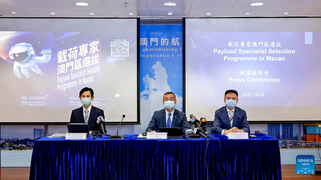 A press conference on selecting payload specialist in China's Macao Special Administrative Region (SAR) to join national space program is held in Macao, south China, Oct. 3, 2022. (Xinhua)