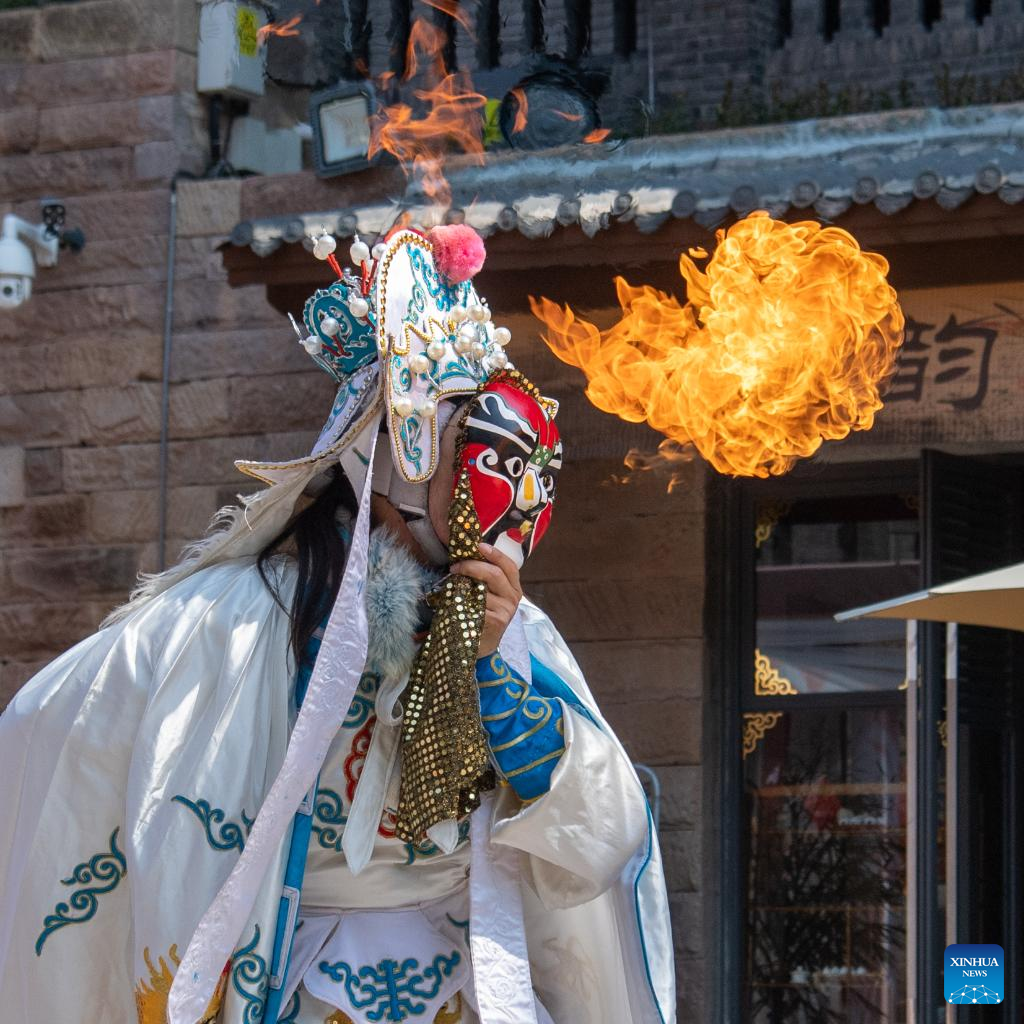 An artist performs Chuanju (Sichuan opera) in Ciqikou ancient town, southwest China's Chongqing Municipality, Oct. 2, 2022. During the National Day holiday, the scenic area Ciqikou has conducted various activities themed with traditional Chinese culture to attract tourists. (Xinhua/Tang Yi)