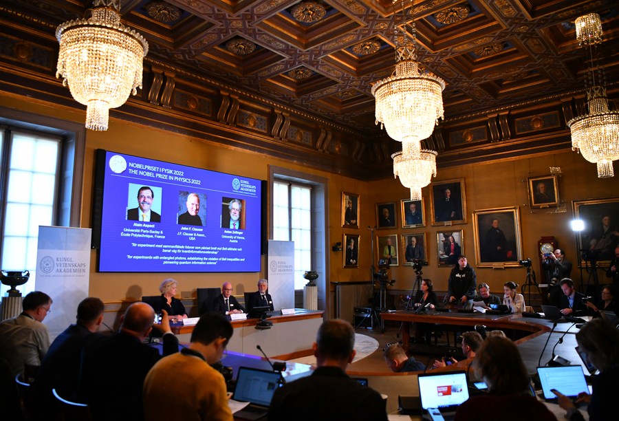 The announcement of the 2022 Nobel Prize in Physics is held in Stockholm, Sweden, Oct. 4, 2022. (Xinhua/Ren Pengfei)