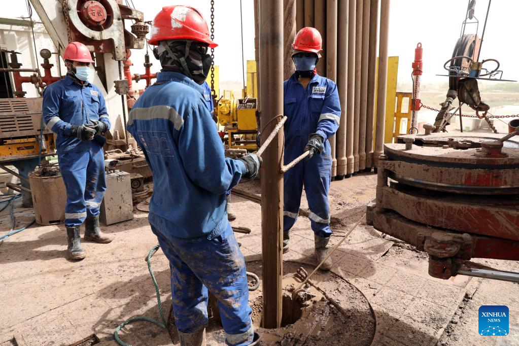 Iraqi employees work on a drilling platform at PetroChina's Halfaya oil field in Maysan province, Iraq, on Sept. 25, 2022. (Xinhua/Khalil Dawood)