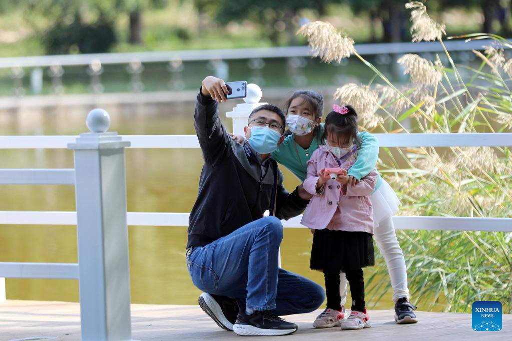 People take selfies at Donghuan park in Shijiazhuang, capital of north China's Hebei Province, Oct. 4, 2022. (Xinhua/Luo Xuefeng)