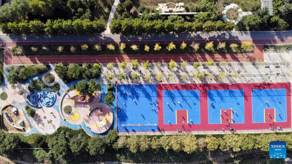 Aerial photo taken on Oct. 4, 2022 shows people enjoying their holiday time at a sports park in Shijiazhuang, capital of north China's Hebei Province. (Xinhua/Luo Xuefeng)