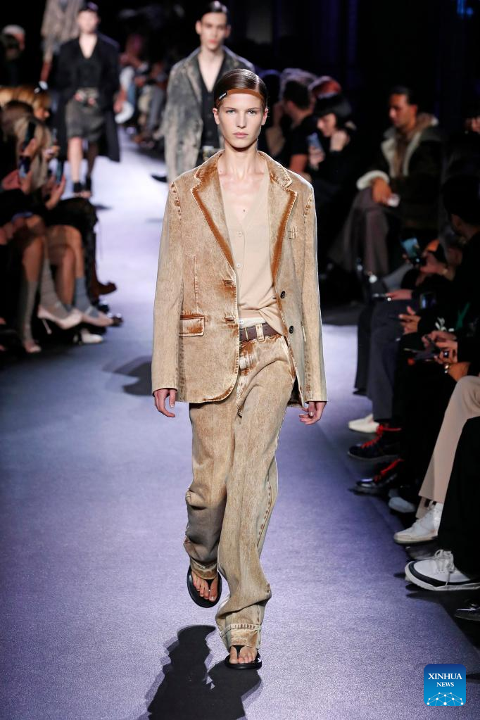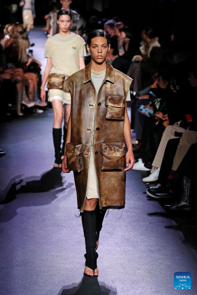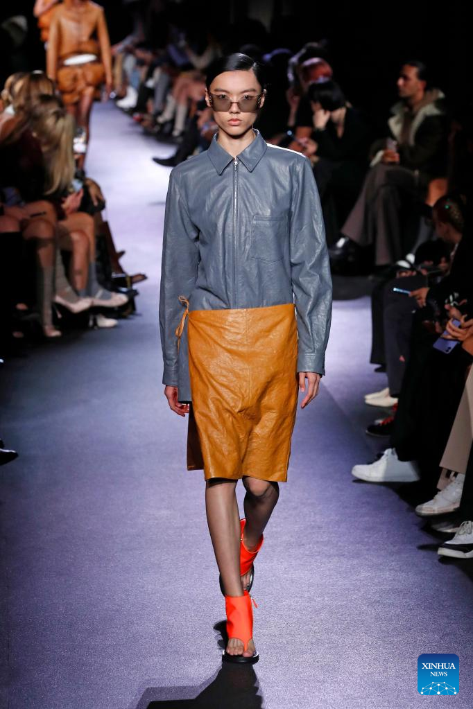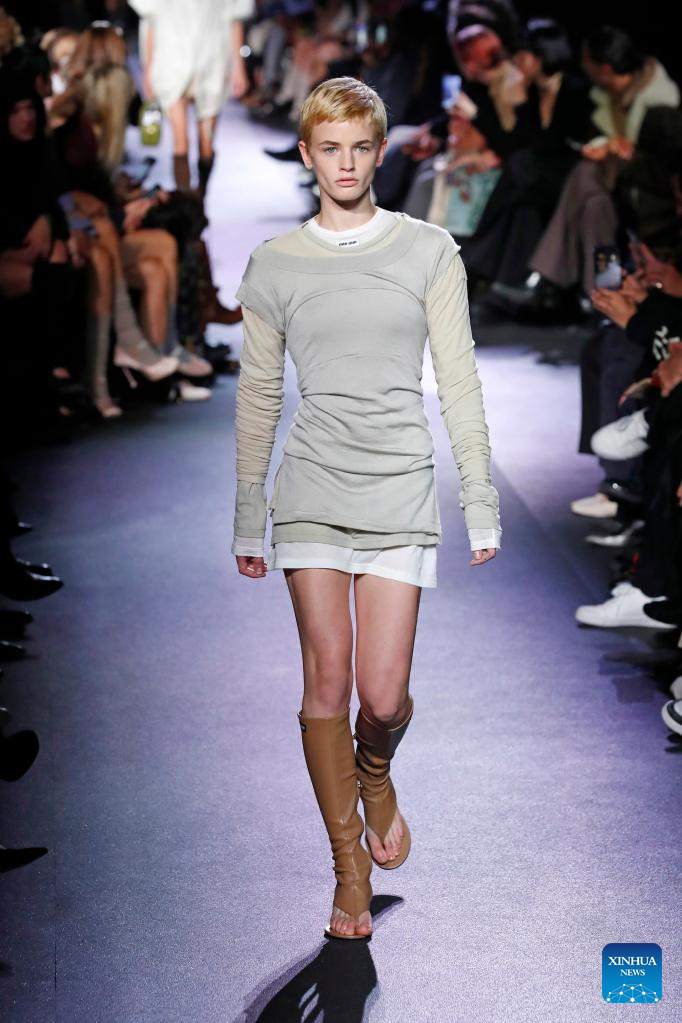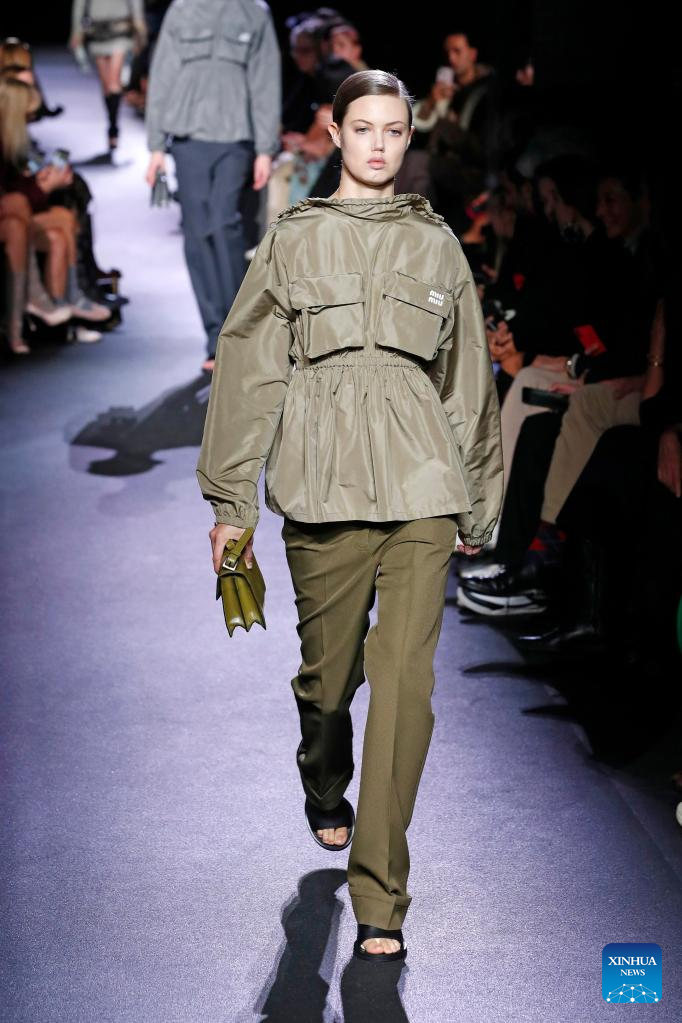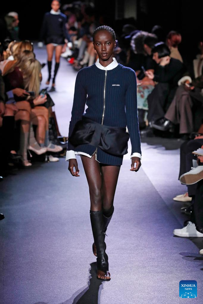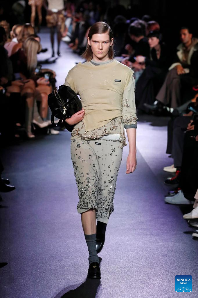A model presents a creation from the Spring/Summer 2023 Ready-to-Wear collection of Miu Miu during the Paris Fashion Week in Paris, France, on Oct. 4, 2022. (Photo by Piero Biasion/Xinhua)