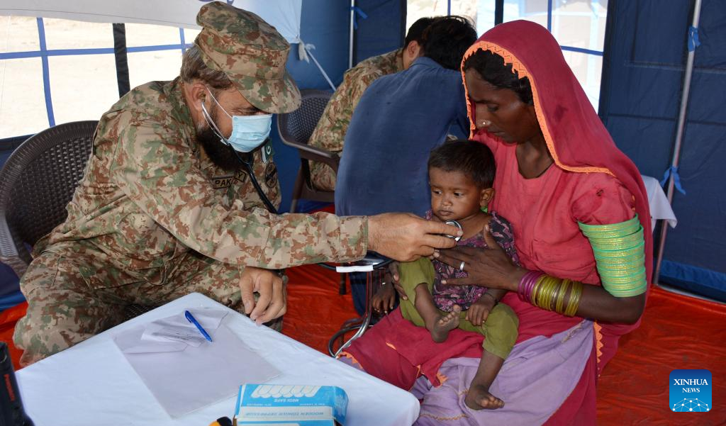 A doctor examines a child inside a tent donated by China in Matli town of Badin District in southern Pakistan's Sindh province on Sept. 29, 2022. (Str/Xinhua)