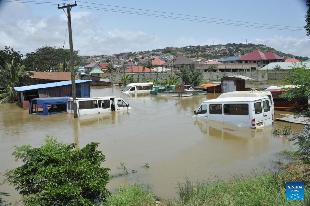 Vehicles are seen trapped in a flooded area in Accra, Ghana, on Oct. 5, 2022. Thousands of residents of the southwestern part of Accra, the Ghanaian capital, have been displaced due to the spillage of the Weija Dam. The spillage of the dam was caused by excess water following torrential rains over the weekend, which contributed to the water level behind the dam rising above the maximum level. The dam built on the Densu River is the source of potable water for more than half of the 5.4 million population of the national capital. (Photo by Seth/Xinhua)