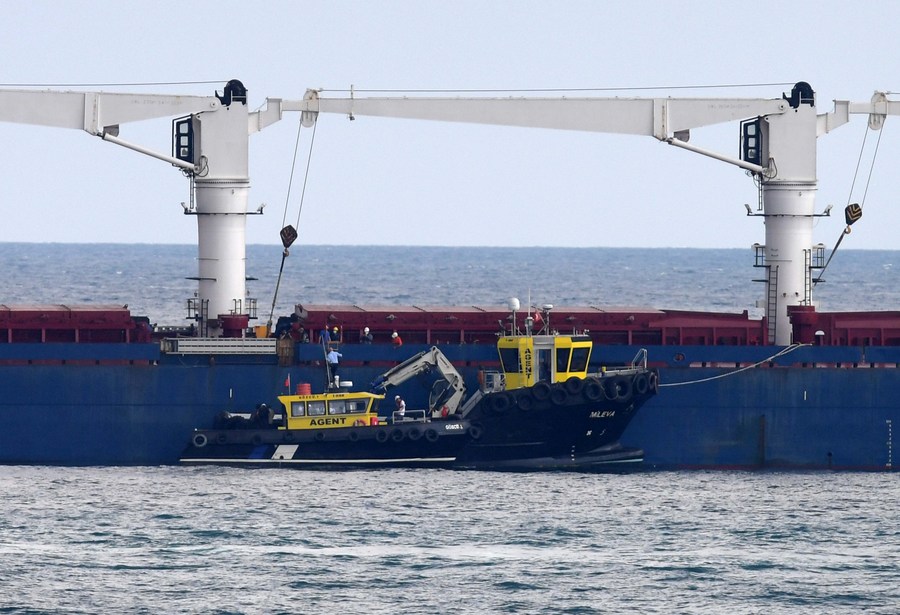 A team of representatives from the Joint Coordination Center (JCC) inspects the first grain-laden ship leaving Ukraine on the northwestern entrance of the Bosphorus Strait in Istanbul, Türkiye, Aug. 3, 2022. (Turkish Defense Ministry/Handout via Xinhua)