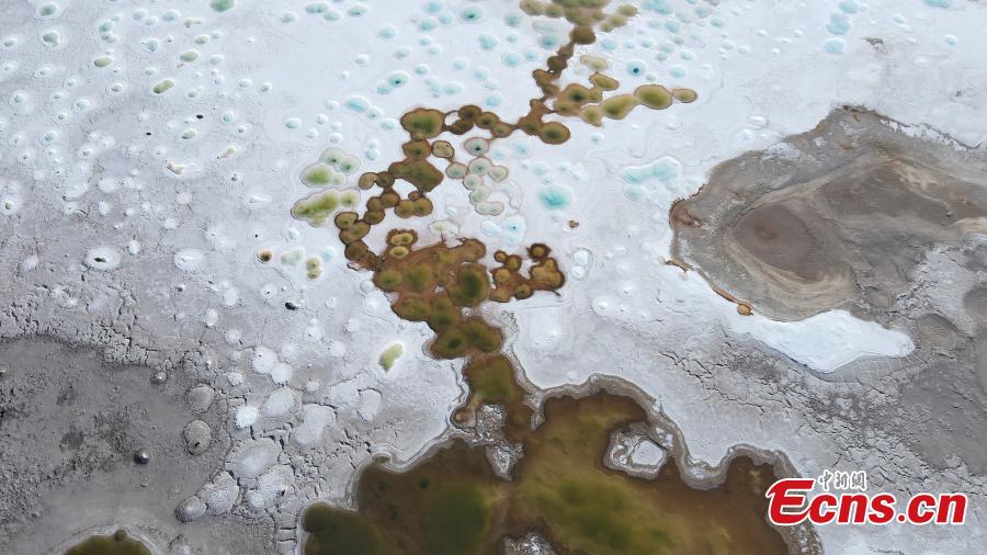 Drone photo shows the natural landscape of the Gaskule Lake in Mangya city, northwest China's Qinghai Province. The brine overflows to the salt flat, looking like an ink painting. (Photo: China News Service/Tang Tuohua)