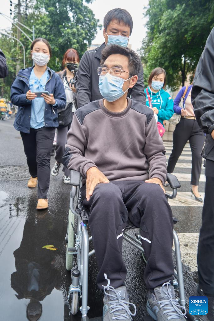 Gan Yu, in a wheelchair after a surgery, leaves West China Hospital of Sichuan University in Chengdu, southwest China's Sichuan Province, Oct. 8, 2022.