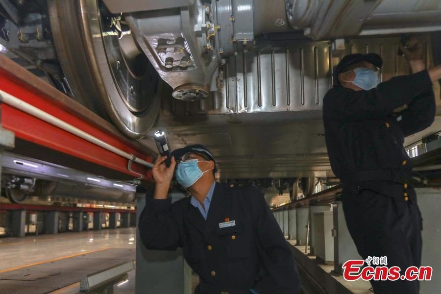 Technicians check the new Fuxing bullet train at a maintenance station of Nanchang Railway in Nanchang, east China's Jiangxi Province, Oct. 8, 2022. (Photo: China News Service/Liu Lixin)